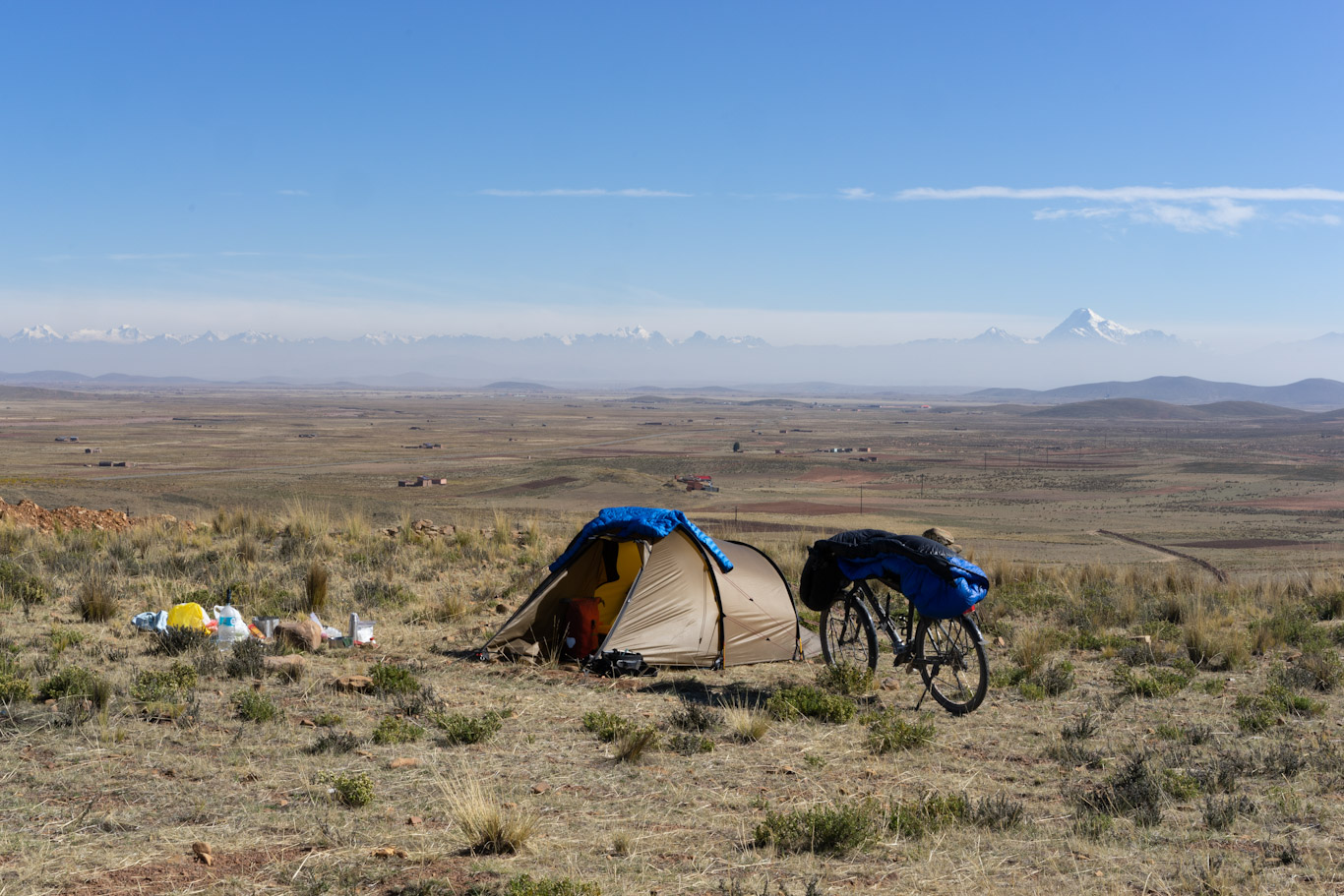 Ein Blick zurück auf die Cordillera Real mit dem Huayna Potosí ganz rechts. Viacha, Bolivien.
