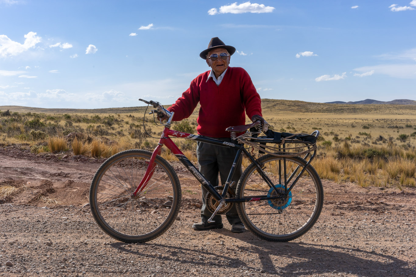 Einheimischer Radfahrer, 74 Jahre alt. Caquiaviri, Bolivien.