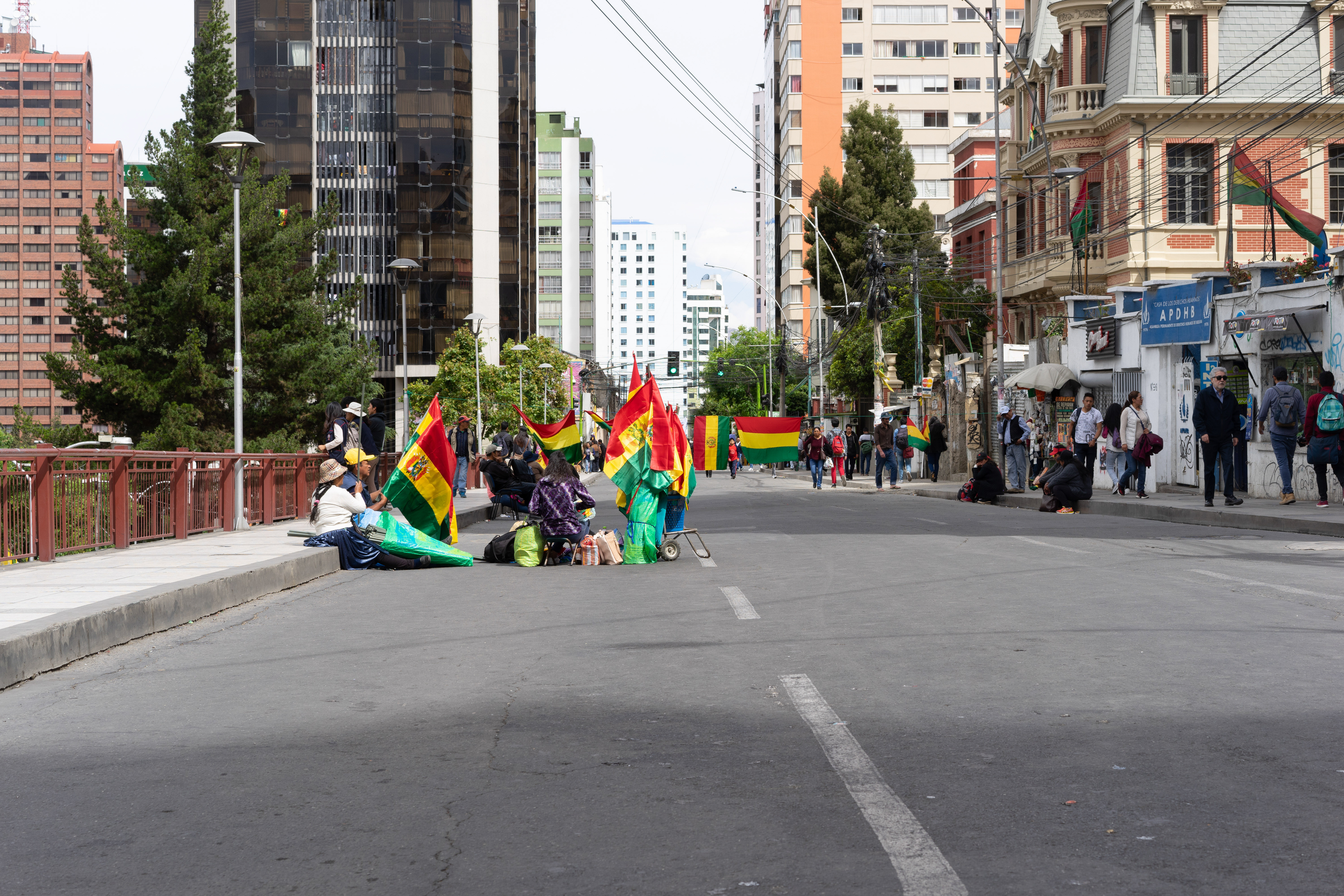 La Paz ist nach den umstrittenen Wahlen vom 20. Oktober im Ausnahmezustand. Widerstand formiert sich. Strassenblockaden legen die Innenstadt lahm. Der Bedarf an bolivianischen Flaggen ist gross. La Paz, Bolivien