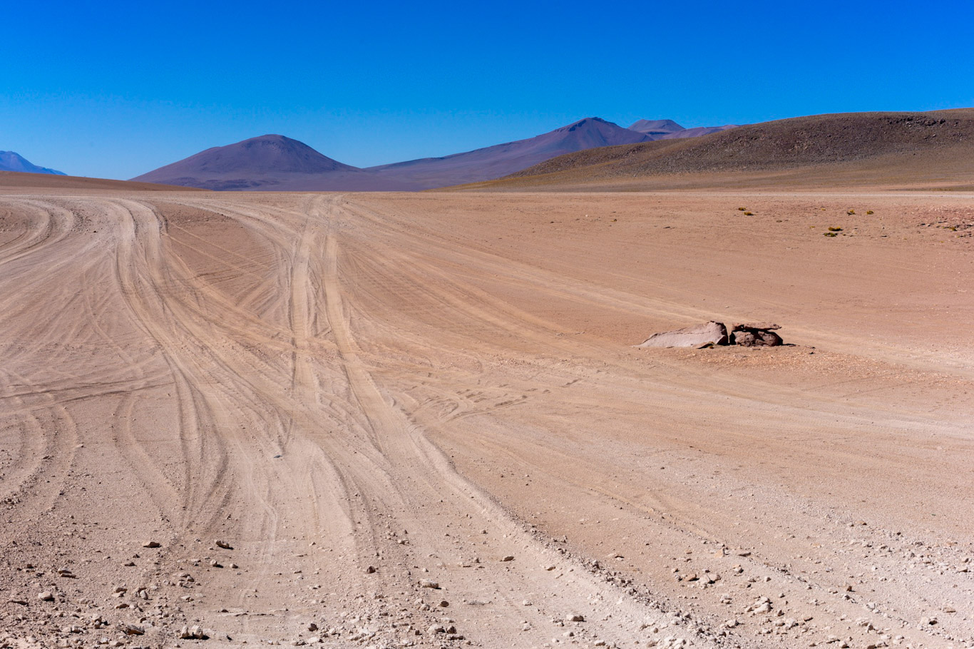 In einer der sandigen Ebenen auf dem Weg zwischen den Lagunen Hedionda und Colorada, in einer für Radreisen realistisch betrachtet ungeeigneten Gegend, habe ich die kräfteraubende Schieberei meines Velos unterbrochen, um gerührt den Lebenswillen eines Pflänzchens zu bewundern, welches weit und breit ohne seinesgleichen, nicht nur der lebensfeindlichen Umgebung sondern, wenigstens bis jetzt, auch den Rädern der Jeeps trotzt, die hier, aus den Spuren zu schliessen, ohne einer bestimmten Fahrbahn zu folgen die Ebene queren, als eben einer dieser Jeeps an uns vorbeifliegt.