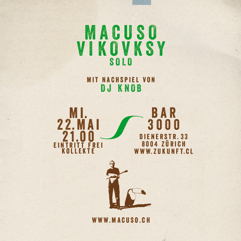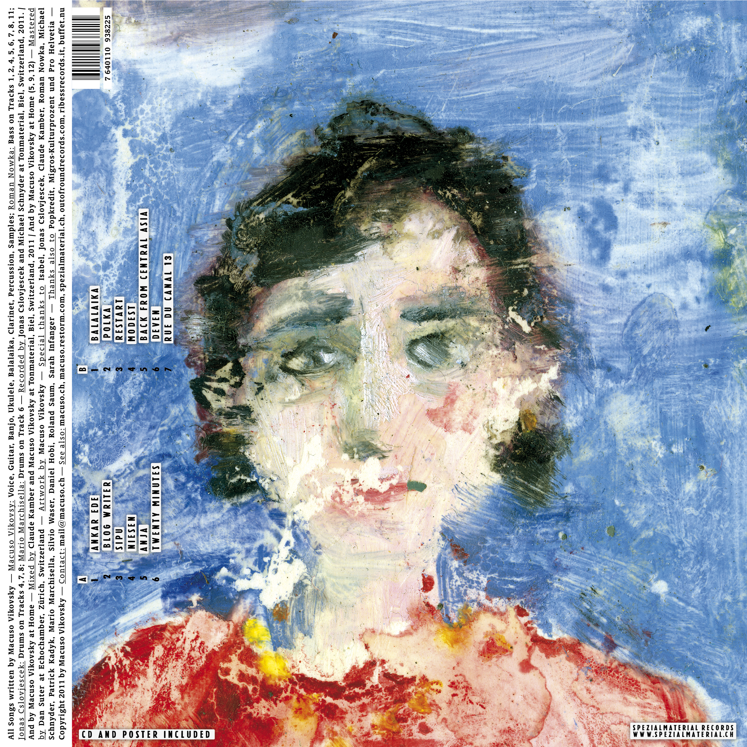 All Songs written by Macuso Vikovsky — Macuso Vikovsy: Voice, Guitar, Banjo, Ukulele, Balalaika, Clarinet, Percussion, Samples; Roman Nowka: Bass on Tracks 1, 2, 4, 5, 6, 7, 8, 11; Jonas Cslovjescek: Drums on Tracks 4, 7, 8; Mario Marchisella: Drums on Track 6 — Recorded by Jonas Cslovjescek and Michael Schnyder at Tonmaterial, Biel, Switzerland, 2011. / And by Macuso Vikovsky at Home — Mixed by Claude Kamber and Macuso Vikovsky at Tonmaterial, Biel, Switzerland, 2011 / And by Macuso Vikovsky at Home (5, 9, 12) — Mastered by Dan Suter at Echochamber, Zürich, Switzerland — Artwork by Macuso Vikovsky — Special thanks to Isabel, Jonas Cslovjescek, Claude Kamber, Roman Nowka, Michael Schnyder, Patrick Kadyk, Mario Marchisella, Silvio Waser, Daniel Hobi, Roland Saum, Sarah Infanger — Thanks also to Popkredit, Pro Helvetia und Migros-Kulturprozent — Copyright 2011 by Macuso Vikovsky