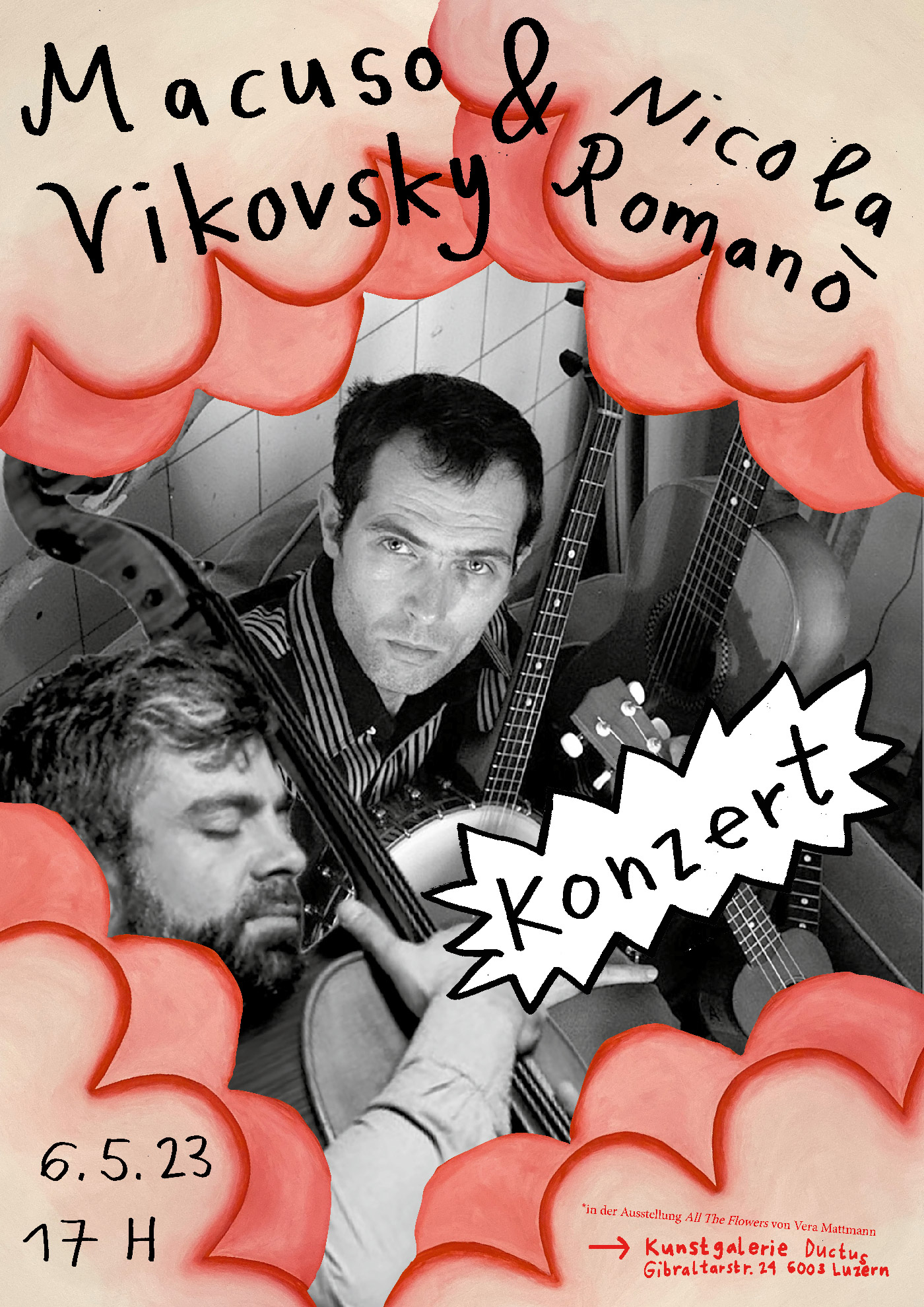 Vera kisses us awake. She has invited us to play a concert in her exhibition at the ductus gallery in Lucerne. May 6, 2023 at 5:00 pm